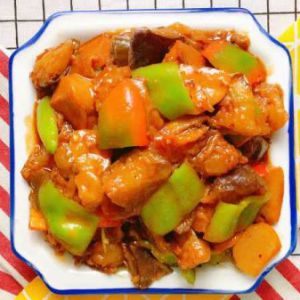 锅中放油,放蒜末和番茄酱炒香,放茄子和青椒煸炒,加调味汁,收汁后即可出锅