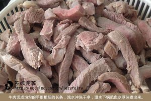 牛肉切成均匀的手指粗细的长条,流水冲洗干净,温水下锅,把牛肉里的血水浮沫煮出来。(补充下,牛肉尽量按肉丝肌理的横茬切,好咬)