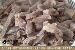 水红后倒掉,冲洗干净牛肉,再换水煮,反复3-4次,直到水比较清澈,肉表面变白。