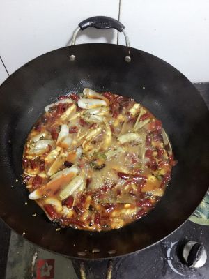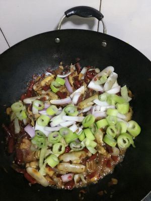 煮至汤汁快干时,放入洋葱,大葱,一点白糖,鸡精大火翻炒均匀