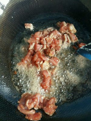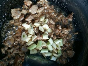 肉变色后倒入葱和蒜。