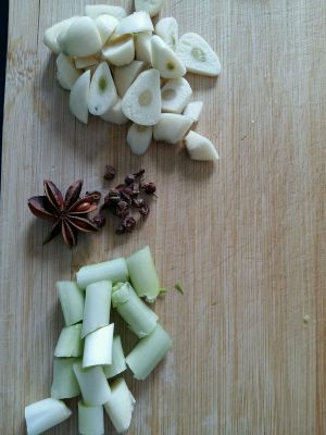 葱花,蒜切成片。花椒和八角准备好。