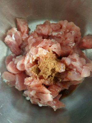 里脊肉切成小块,倒入少量生抽和五香粉腌制一下。