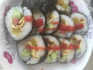 卷的时候稍微用力、要不然切的时候容易散、如果怕米饭粘在寿司席上可以放一张保鲜膜
