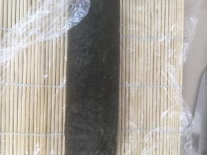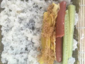 寿司席放上紫菜把米饭铺满再放上提前准备好的菜