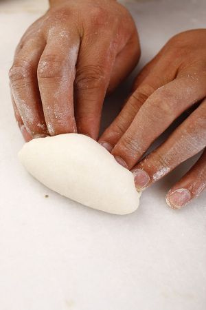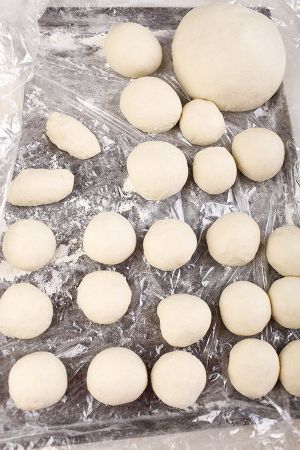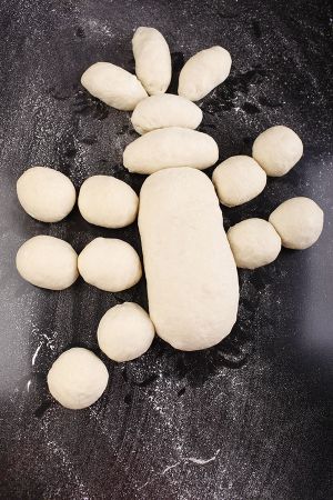将面团各分割成250克,25克,40克,30克,20克,15克滚圆松弛20分钟。