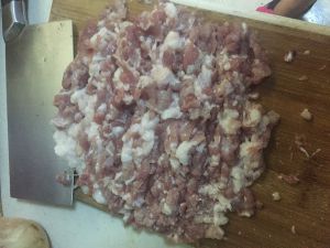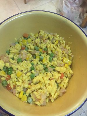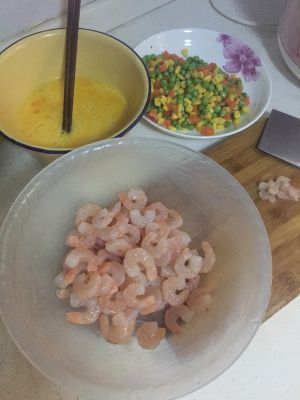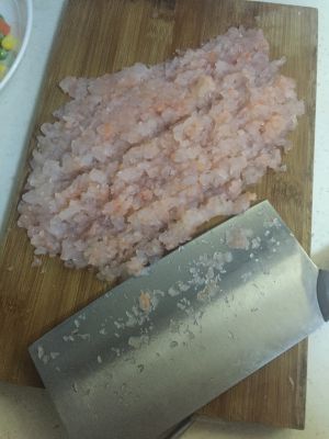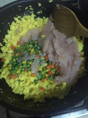 鸡蛋,肉末,虾仁末,甜豆放一起这时候关火,用余温拌馅
