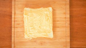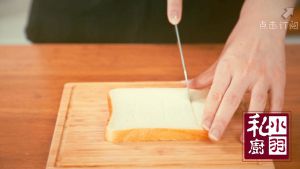 ▲将拌好的蛋奶酥馅均匀的涂抹在两片面包上。