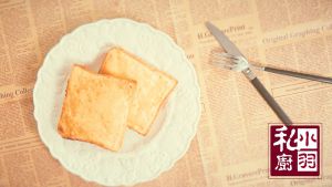 ▲把吐司片用刀横三竖三的切上六刀,只切吐司的里面部分,吐司的边边不要切到,这样可以让蛋奶酥馅进到吐司片的里面,口感更好。