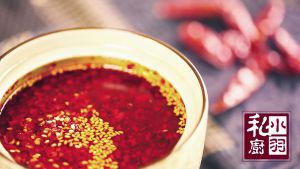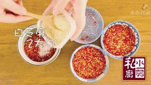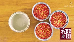 ▲所以要做出又辣又香又红的辣椒油,就要在三个不同的油温时,分别倒入辣椒面里。