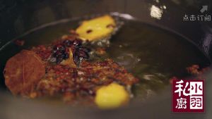 ▲接着来烧油,油微微加热后就放入八角、花椒、香叶和姜片。