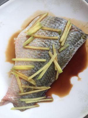 ➕盐➕少许蒸鱼豉油➕少许味极鲜酱油➕姜丝,上蒸锅
