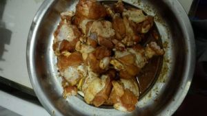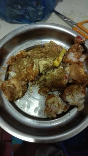 放入料酒、盐、糖、胡椒粉、生抽、辣椒面、孜然粉、姜粉、葱姜蒜放冰箱腌制一夜
