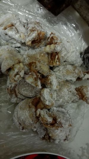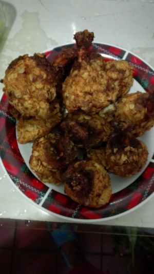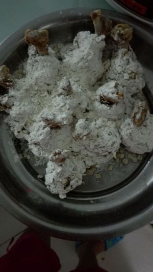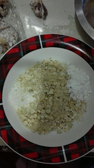将粘裹好蛋液的鸡翅根放入面粉和燕麦片中粘裹一下拿出'