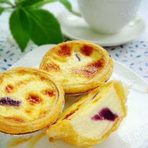 将蛋挞皮放烤盘里,紫薯块放挞皮里。