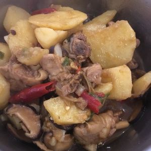 加入土豆 加入温开水 水量大概能盖住菜为佳 大火烧开锅之后转中小火 慢慢炖煮 待土豆和肉熟差不多时 加入盐 大火收汁即可 (查看肉和土豆熟不熟可以用筷子插一下试试 能插进去就是熟了)