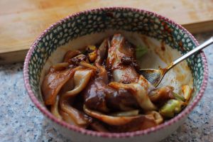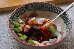 放到碗中,加入葱、姜、蒜、料酒、蒜蓉辣酱、烧烤酱、大酱