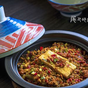 将茄条码入塔吉锅中,加入炒好的肉馅