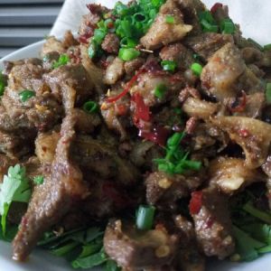 一开始大火翻炒。至羊肉变色中火开始煸香。期间分多次适量撒入孜然粉或孜然粒,调整口味。直至锅底发干,羊油被煸炒出来滋滋冒香。