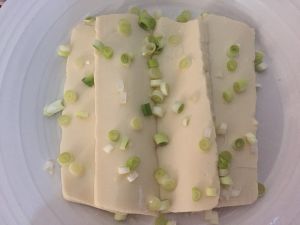 酱豆腐倒扣在容器中脱模,豆腐用刀轻轻的切几刀,切下来的片顺其自然摆到旁边撒适量小葱末