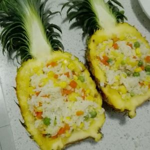 青豆,玉米洗净,胡萝卜洗净切小块,菠萝一个,对半切开,用勺子挖出菠萝肉待用