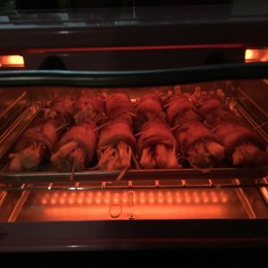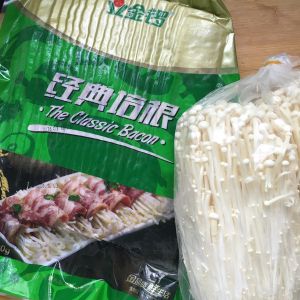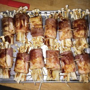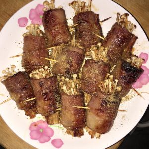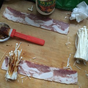 培根铺好弄一些培根卷好插上牙签,最好卷的时候把金针菇抹上烤肉酱这样进味