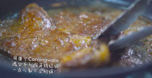 热锅,将腌制好的牛排放入康宁陶瓷铸铝锅里煎制,等肉身变色后加入红酒,至两面煎熟。