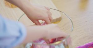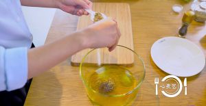 把少许品利中级初榨橄榄油倒入碗中,再加入黑椒碎,迷迭香,少许盐和红酒充分搅拌,作为腌料备用。