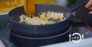 把洋葱切碎,放入锅中底油中炒至变色,再加入黑椒碎和少量水,煮至浓稠,放少许盐调味,盛入碗中作为蘸料。减脂牛排的做法 步骤5