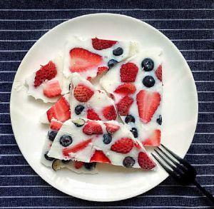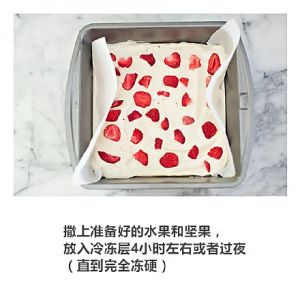 撒上准备好的水果和坚果,放入冷冻层4小时左右或者过夜(直到完全冻硬)