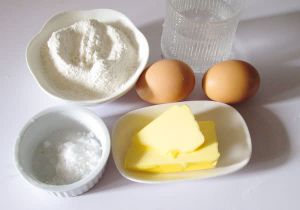 准备好泡芙材料。泡芙;黄油 50克 糖 3克 盐 1克 低筋面粉 75克 水 125毫升 鸡蛋 2个