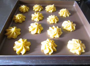 均匀挤在不沾烤盘上,中间要保留出足够的距离。