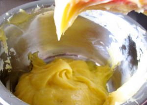 直到搅拌成为有光泽的面糊,并且能够挂在铲上形成倒三角状态(如图),即可。