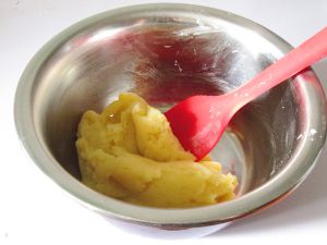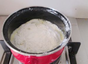 快速搅拌成面团后再次将锅置于火上,开小火,用铲不停搅拌面团,直到面粉全熟。