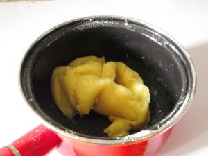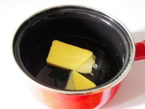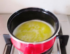 将切成小块的黄油和水、糖、盐,一起加入到锅中。