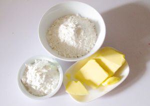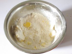 软化的黄油加入糖 糖粉和低筋面粉,用手搓均,成黄油粒。