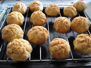 烤好的泡芙放在烤架上晾凉,然后就可以加入自己喜欢馅料了。