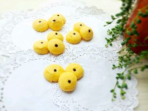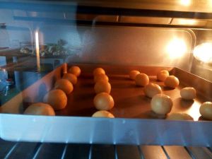 揉成小球,中间用筷子扎一个小圆点,放入预热好的烤箱,中层上下150度,15分钟。