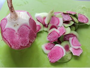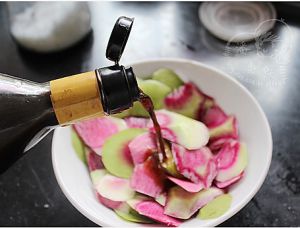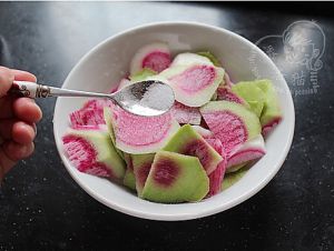 在萝卜皮上撒些盐拌匀后等个十分钟左右,萝卜皮会出一些水,把水倒掉。