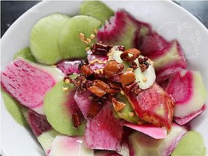 把麻辣油再淋到萝卜皮上拌匀就可以啦。