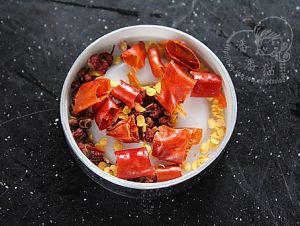 锅底烧一点油,油冒烟后关火。把花椒和干辣椒段倒进锅里,马上就能闻到麻辣诱人的味道。