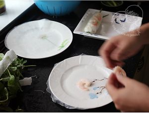 用热水将春卷皮泡软放到大点的圆盘上这样便于后面的操作。