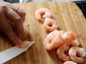 鲜虾去皮后煮熟,煮的时候要短,好保持虾的鲜嫩。煮好的虾从中间切开。