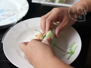 在薄如蝉翼的越南春卷皮上放对半切开的虾仁。
