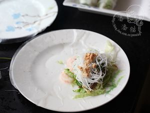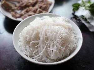 首先把米线用开水烫软后,沥去水分。我觉得越南饭挺逗的,米粉、河粉、还有春卷皮都不用煮和蒸,只要用开水烫一下就可以吃了。