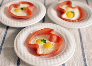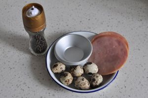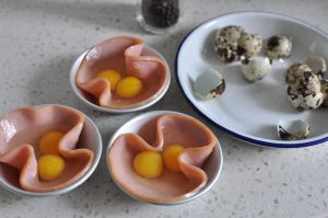 火腿片铺在模具上,里面打两个鹌鹑蛋。
