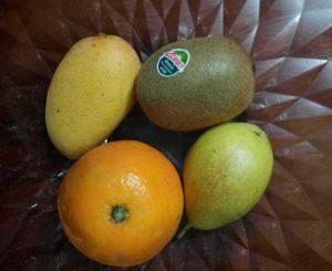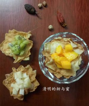 等炸至金黄,沥干油取出晾凉,水果去皮切丁。