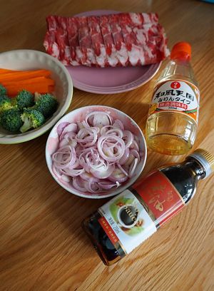 1.洋葱切丝,肥牛解冻,过水去除血沫,洗净待用。