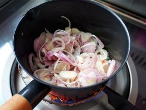 3.另取一锅,加入油,将切丝的洋葱加入,煸炒至变软,随后全部加入酱汁锅中,