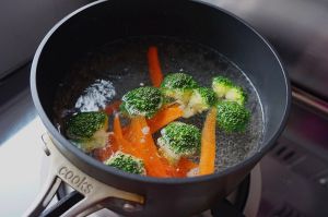 胡萝卜切片、西兰花掰成小朵,滚水烫熟捞出冷却待用。